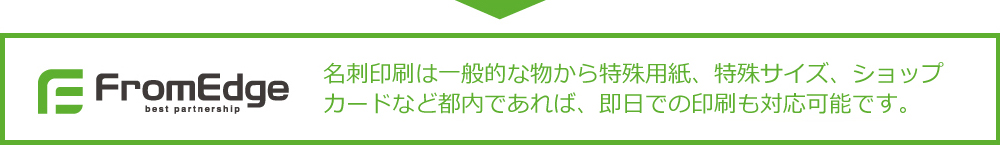 弊社では、名刺印刷は一般的な物から特殊用紙、特殊サイズ、ショップカードなどの印刷都内であれば、即日での印刷も対応可能です。 お気軽にご相談ください。商品・会社・学校案内、商品カタログ、フリーペーパー、ガイドブック、情報誌、PTA会報などは小ロットから承っております。 また、封筒・ハガキ印刷は宛名印刷も承っておりますので、すぐに投函できる状態で印刷物をお渡しすることができます。 ノベルティーは名入れ・ライター・卓上カレンダー・ポケットファイル・ポスター・DVDプレスセット・タオル・オリジナルTシャツ・団扇・のぼり など承っております。 この他にも「こんなものに名入れしたい」というご要望がございましたら、ご遠慮なくご相談ください。
